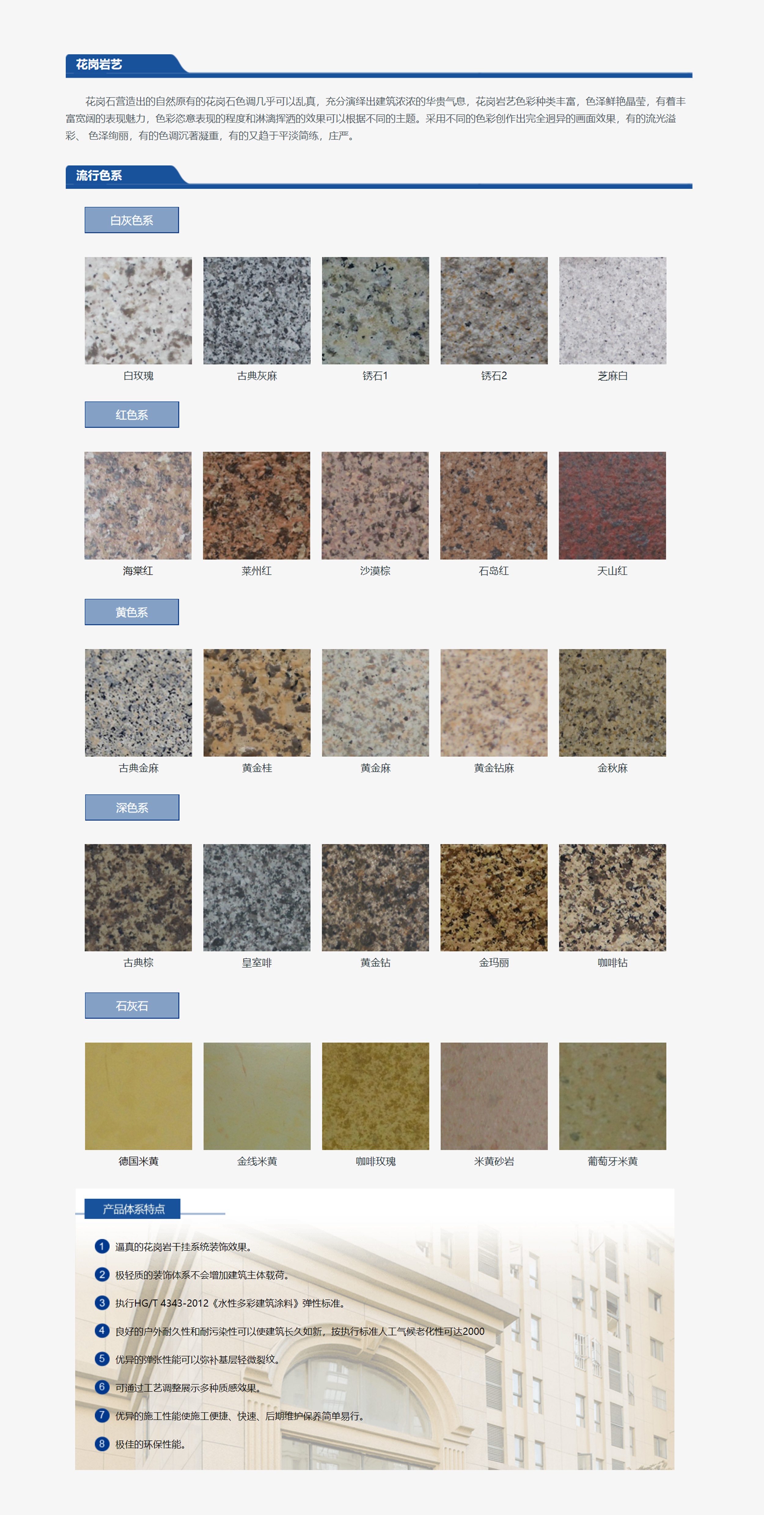 花崗石營造出的自然原有的花崗石色調幾乎可以亂真,充分演繹出建筑濃濃的華貴氣息,花崗巖藝色彩種類豐富,色澤鮮艷晶瑩,有著豐 富寬闊的表現魅力。